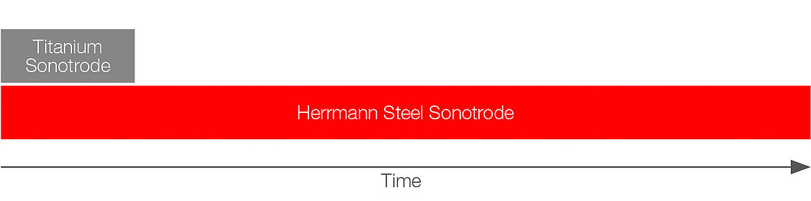 O sonotrodo de aço endurecido da Herrmann é até 5 vezes mais robusto do que os sonotrodos de titânio padrão. Se necessário, também é possível retrabalhar a tecnologia de corte - isso estende a vida útil do aparelho ainda mais.